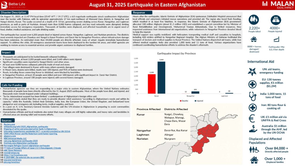 On August 31, 2025, at 11:47 PM local time (23:47 AFT / 19:17 UTC), a 6.0 magnitude earthquake struck southeastern Afghanistan near the border with Pakistan, with its epicenter approximately 27 km east-northeast of Momand Dara district, in Nangarhar and Nurgul district, Kunar. The quake occurred at a depth of 8–10 km, generating severe shaking …